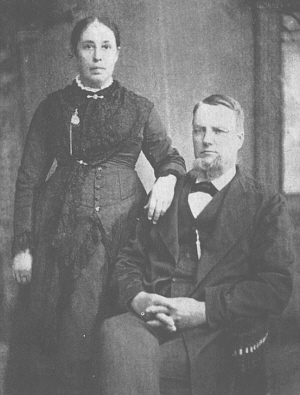 Amanda & Nelson Marsh Nelson Marsh did lots of different things for his pioneer neighbors. He sorted (but did not read) their mail; he mended their shoes; he pulled their teeth with an old style turnkey. Honest and able, he did not need to be a good penman. So when he sent to Washington the name of the new post office, the dull boys down there could not make out his writing. He wrote "Maple Wood" but they thought he wrote "Maple Works." So they gave it that name, and the name stuck. Oxen Were Better A few miles out of Sparta they came upon the George Williams family, bogged down in the mire. The ox team was hitched on and soon the party was on dry land. Mr. Williams had not heeded the advice about oxen and had kept his horses, but as they were all headed for the same part of the county, they joined forces and the rest of the journey was completed with- out incident, except this:- As they were fording a sizable stream, the Williams hog broke out of its crate and went down the stream, never to be seen again. This little caravan left Neillsville (then only a few houses) and followed the trail to what is now the Harold Huckstead farm. From there, they drove through the virgin forest to the Wage holding, now the Eugene Theide farm. The men folks all joined in and soon had a log dwelling built to house the women and children. Then the men proceeded to erect similar dwellings for Levi Marsh (now the Walter Trimberger home) and then went on to the Williams land (now the Arno Sternitzky farm). These three families became fast friends and all the work was shared by the men folks. Large trees were felled and burned so as to clear the land. They planted gardens among the stumps to supply food. They had reached their destination in June 1856.