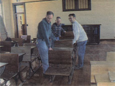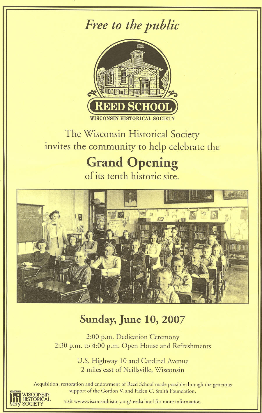 Prep time at Reed School From: Clark County Press, Neillsville, WI April 18, 2007 Transcribed by Dolores Mohr Kenyon. The Wisconsin Historical Society was out at the old Reed School in obvious force on Monday, getting ready for the fast-approaching June 10th dedication of the former one-room school house along U. S. Highway 10 east of Neillsville. Coming up from the Society offices in Wisconsin Dells to move some of the old, traditional row of desks into place are (from left to right) Greg Parkinson, deputy administrator of historical sites, Dale Williams, director of the Reed School site and Jeff Murray, curator of education. The 93-year-old school building is expected to be ready to “teach” once again before June 10th. The Wisconsin Historical Society will be opening its doors with special interpretive lessons for area 4th-graders starting on May 14th. Invitation to the