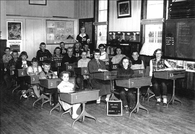 Bee Hive School Grades 1-8, 1956 1. Diane (Woik) Harington 2. Delly Buss 3. Marcella (Grube) Sobeck 4. Alice Anderson 5. Kenneth Grube 6. Douglas Grube 7. Charlotte (Thess) Miller 8. Helen Mach 9. Melvin Koplitz 10. Glenn Lampi 11. Jerry Hill 12. Myron Buss 13. Patricia Gustafson 14. Bobby Buss 15. Carol (Buss) Raatz. 16. Judy (Bjorn) Kalson 17. Richard Grube 18. Marlene (Lampi) Roberts 19. Albert Buss 20. Teacher, Mrs. Mary Blazer |