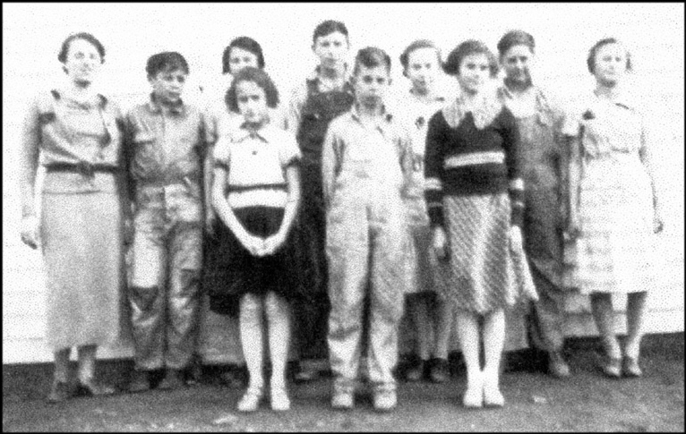Rear, Left to Right: Miss Grace Hardrath, Teacher (Graces father, William, and my father were second cousins.), Paul Rossow, Lorraine Klessig, Delos Alexander, Elaine Witt, Halbert Bud Hardrath, Irene Molle.