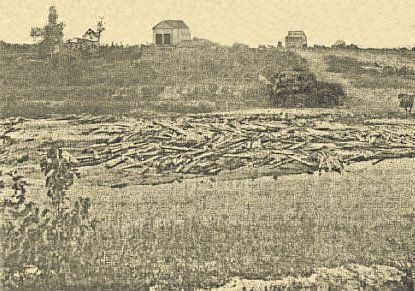 An 1896 view of Columbia, Wisconsin, from the east side. A boarding house, a saloon, and general store can be seen in the background. William Farning operated the saw mill at Columbia, at the confluence of Five Mile Creek and Wedges Creek. The Slashings from the mill can be seen along the creek bank, as well as a few cows grazing nearby. (This photo is from the collection of Ruby Yndoliato and presented by Dee Zimmerman in her "Good Old Days" Column in the Clark Co., Press, Neillsville, WI March 9, 1994.) |