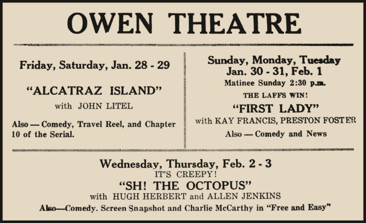 One of the most heavily attended shows occurred in April 1937, when the Educational Road Show Pictures brought “Shame” to Owen during a “midnight show.” A 35 cent admission allowed those over 16 years of age in to this show about the disappearance of 75,000 young girls yearly, highlighting San Francisco’s Barbary Coast as a “breeding place of vice and sin.”