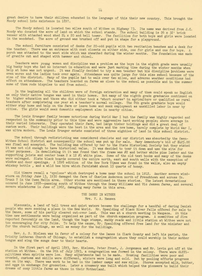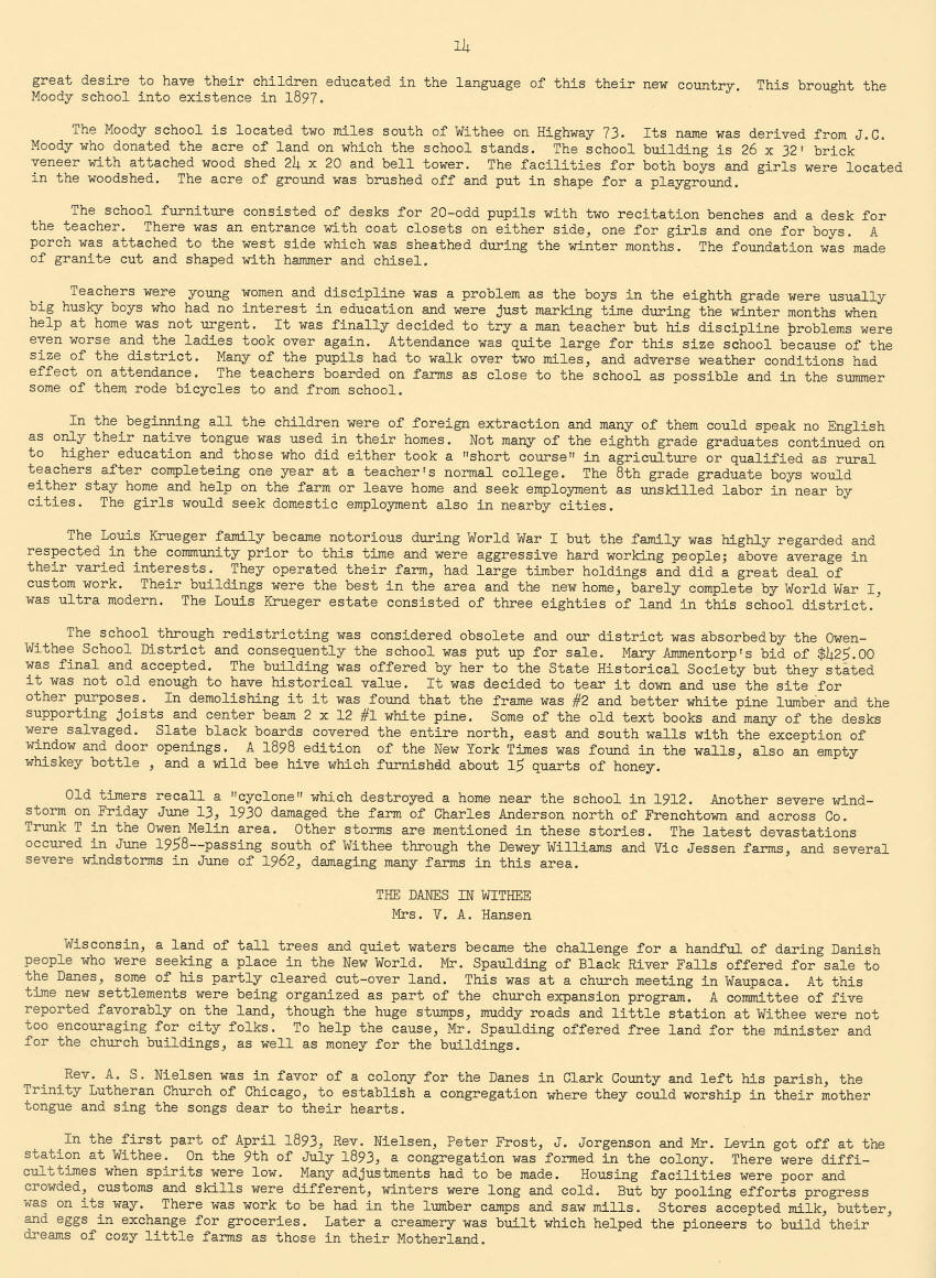 The Moody school is located two miles south of Withee on Highway 73. Its name