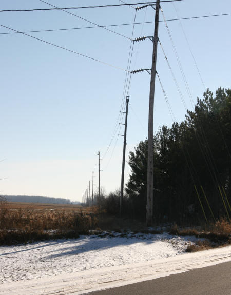 Today these power lines follow the trail of the Fairchild & Northeastern railroad tracks that have since been removed.