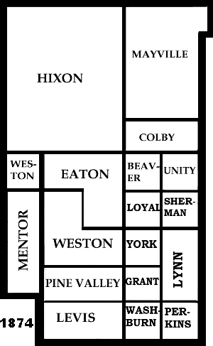 On this 1874 Clark County, WI Township Map, Hixon encompasses today's townships of Hixon, Withee & Thorp as well as portions of Hoard, Longwood, Reseburg & Worden.  (Map of the Current Township Boundaries)