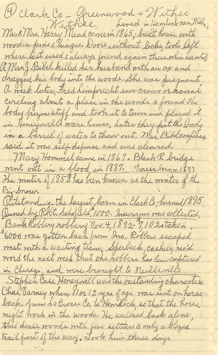 Mr. and Mrs. Harry Mead came in 1865 and lived i Hemlock near Withee and built a house with wooden pins and hinges. Doors were without wax and tools were left where last used and always found again there when wanted. Mrs. J. Bibel killed her husband with an ax and dragged his body into the woods. She was pregnant. A week later, Fred Limprecht saw crows or ravens circling about all place in the woods and found the body frozen stiff and took it to town and placed it in Honeywell's warehouse. Later, they put the body in a barrel of water to thaw out. Mrs. Bibel confessed and said it was self defense and was cleared.