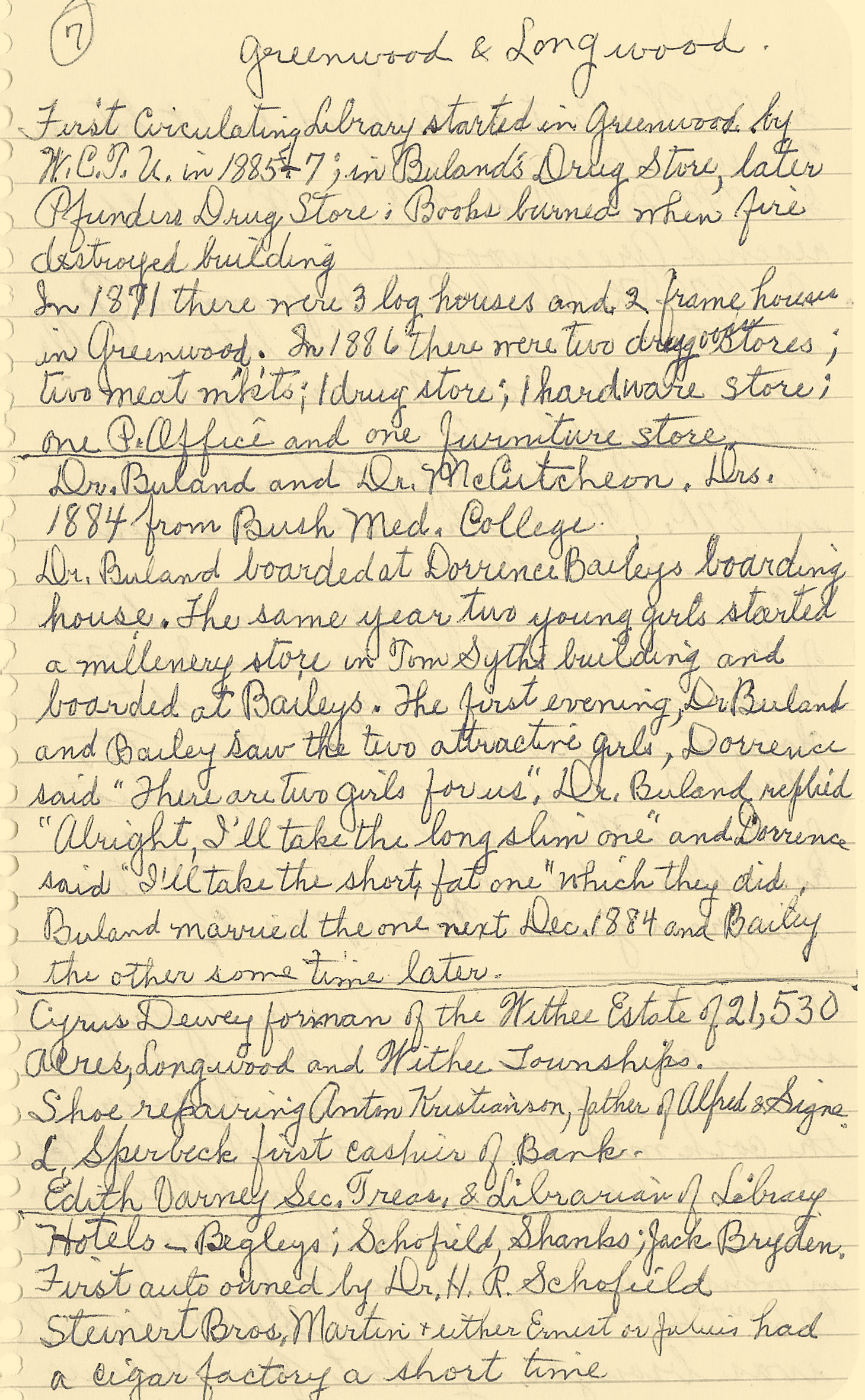First circulating libraries started in Greenwood by WCTU in 1885-1887, in Buland's Drug Store (later Pfunders Drug Store) blocks burned when fire destroyed building.
