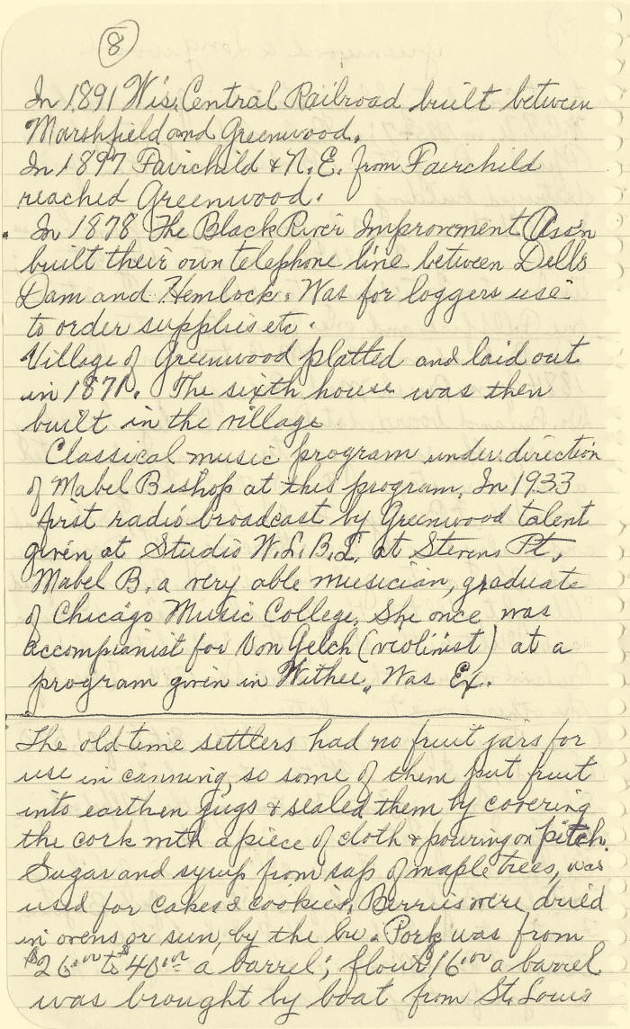 In 1891, Wisconsin Central Railroad built between Marshfield and Greenwood.  In 1897, Fairchild & Northeastern from Fairchild reached Greenwood.  In 1878, the Black River Improvement Association built their own telephone line between Dells Dam and Hemlock.  Was for loggers to use to order supplies etc.