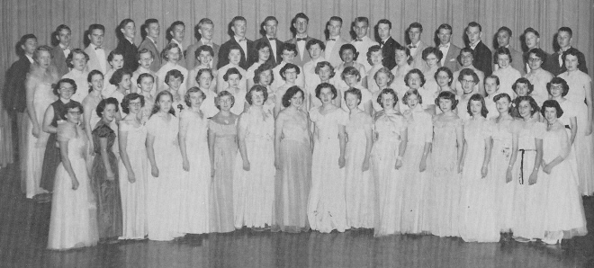After two years of organization under the direction of Mrs. Theime (sic), the chorus has increased in membership from fifty-nine students to the present seventy-two voices. They assemble every Tuesday and Friday to prepare themselves for participation in programs such as Christmas, spring concerts, baccalaureate and the annual tournaments.