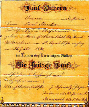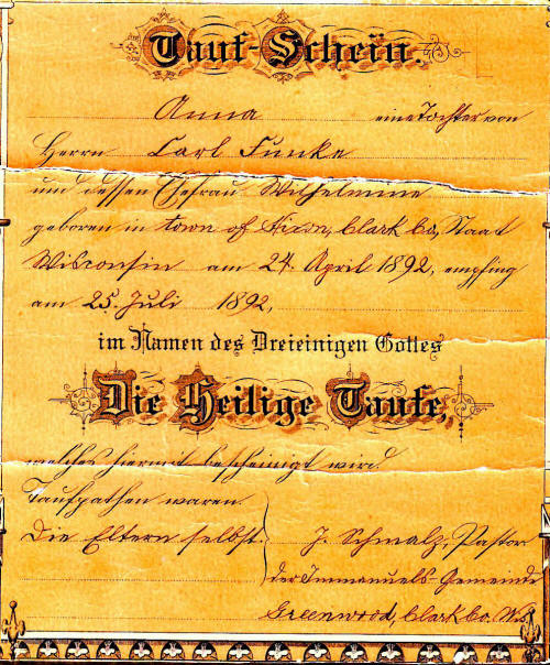 Birth Certificate or certificate of Baptism for Anna Funk.  I cannot read German and would appreciate some help from someone who can.