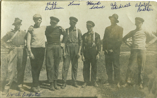 92 Wisconsin Farmers often times earned extra cash by thrashing grain in the West. This photo of Cliff Benneman, Louis Hardrath, Hank Scheel, Al Hardrath & Adolph Brecker was taken in Cooperstown ND in 1913. |