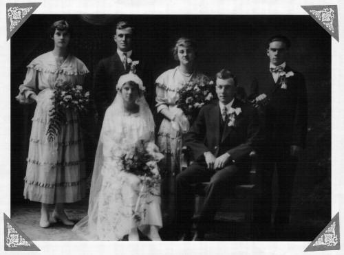 Wedding picture of Edwin and Ella Reineking Steiger, Standing; Selma Reineking, unknown, unknown, Arthur Reineking
