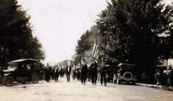 Photos of July 4th Celebration1924, written on back ; picture on left taken with Zion E & R Church in background.  Top right picture needs to be identified for location in Greenwood, Contact us.  Bottom right is parade with main street buildings in background, Volk Bros Tailor’s building, first one on the left.  Note in these pictures sidewalks were in place, but streets were not paved.