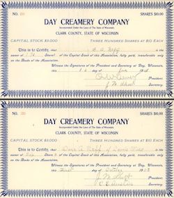 The surviving two Day Creamery ledgers with July 1903-January 1906 payment records (with many pages missing) and stock issuance indicate that there was a reorganization of the Day Creamery Company in 1902 with new stock issued beginning in 1903. The following were paid for “old stock” in July 1903: R. W. Canfield, one share $5.00; Mrs. H. Halvorson one share $5.00. In January 1904: R. F. Goss, one share $5.00; February 1904 H. Westby one share $5.00; November 1904 A. Lauber one share $5.00. 1903 dividends to the new shareholders were paid in January 1904 at the rate of $1.50 per share. Payment and stock records indicate that fractional share “dividends” were issued to the stockholders in lieu of cash for 1904-1913.