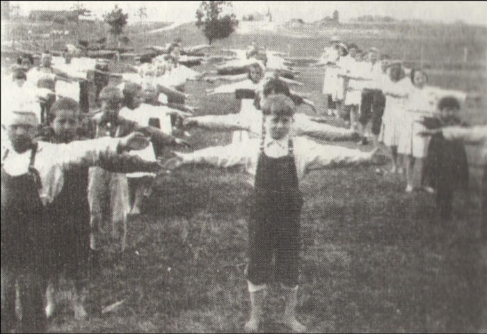 Some of the daily exercises which the pupils were expected to do are pictured above. Notice the girls wore dresses in those days and most of the children went barefooted in the warmer weather.