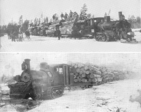 This picture was taken in the Withee area many years ago This is one of the first steamers as they were called, to come into use. You will notice the track on the wheels and the runners on the front. The men were local residents. Before these steamers came into use it was not possible to haul such large loads of logs with horses. Steam powered these machines, the steam was produced by shoveling coal into a boiler.