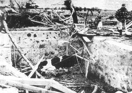The national Guard was called and stationed at our corner to keep sightseers out. This was indeed a bad time for the people living in our area. But it could have been much worse. It was a year of no profits as buying all our feed for the cattle was very expensive. We were just thankful to be alive and well. These pictures were taken in the month of June 1958. Ruins of the dwelling on the John Lato farm, about four miles south east of Thorp. Where Mrs. (Alice) Lato was killed in a tornado which swept through the northern part of Clark County shortly after eight o'clock on a June evening in 1958. Her body was blown from the building and found in a nearby farm field. The cow in the basement, still alive, either fell or was blown there during the tornado. Traffic on 29 which is now County X was forced to detour around Owen when the waters of Brick Creek, swollen from the heavy rain which fell during the windstorm, covered nearly two blocks of the roadway.