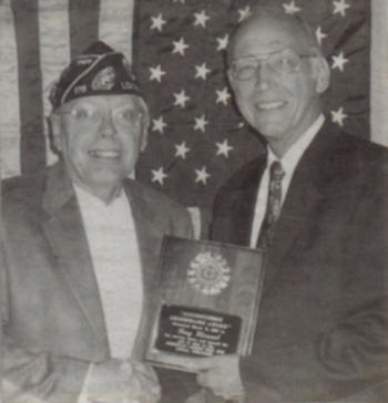 A 90-year anniversary celebration was held March 21 at the Loyal American Legion. Commander Pete Rinka (left) awards Legion member Gary Weirauch the distinguished “Legionnaire of the Year” award for his many hours of helping the Legion with its various projects and fundraisers. (Contributed Photo)