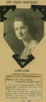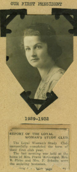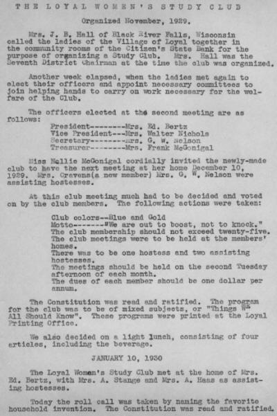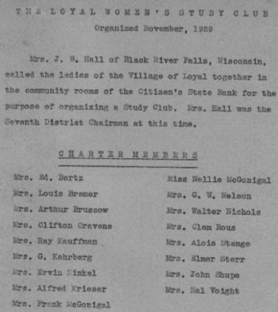 Mrs. J. B. Hall of Black River Falls, Wisconsin called the ladies of the Village of Loyal together in the community rooms of the Citizen’s State Bank for the purpose of organizing a Study Club. Mrs. Hall was the Seventh District Chairman at this time.