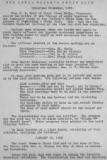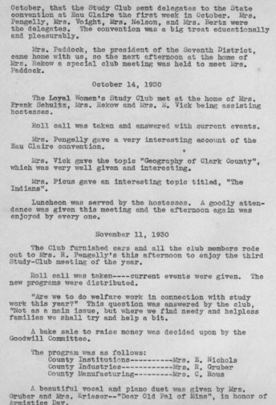 Just a note between the two meetings, September and October, that the Study Club sent delegates to the State convention at Eau Claire the first week in October. Mrs. Pengelly, Mrs. Voight, Mrs. Nelson, and Mrs. Bertz were the delegates. The convention was a big treat educationally and pleasurably.