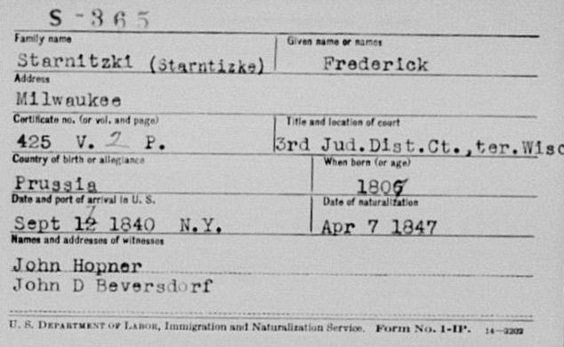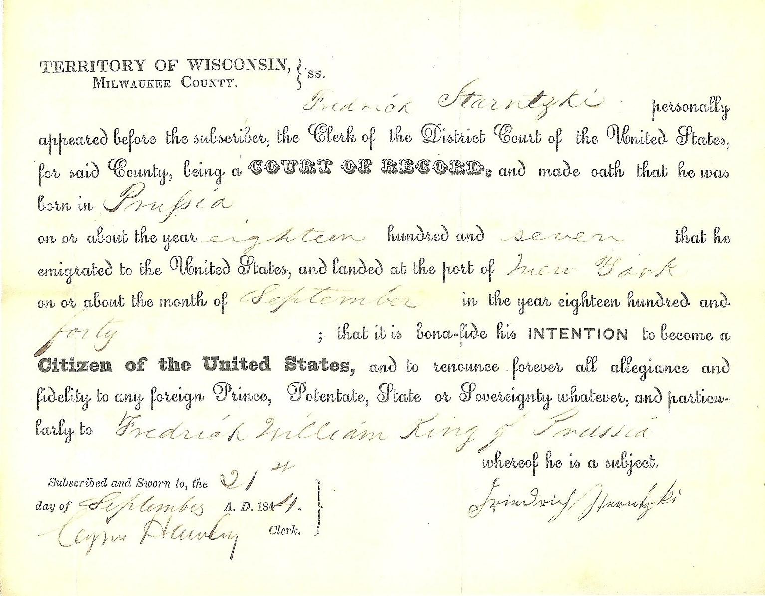 The 1848-1849 Milwaukee City Directory (page 125, Ward 2) lists Frederick Staneske, laborer, living on Eighth Street. The August 24, 1850 Census for Milwaukee 4th Ward (page 459) lists Frederick's occupation as laborer. The 1851-1852 Milwaukee City Directory lists Frederick Steirnetz, laborer, house at the corner of Eighth and Cedar. The block containing the 8th Street and Cedar Street intersection is now in the block containing the Milwaukee Public Museum. During the time they lived in Milwaukee (1841-1856) Frederick and Helena bought forty acres of land near Milwaukee. From the biography of Charles Sternitzky, "Biographical History of Clark and Jackson Counties, Wisconsin", Lewis Publishing Co., 1891, pages 377-378. On September 21, 1844, Friedrich Sternitzki filed an intention to become a Citizen of the United States. It was filed at the Territory of Wisconsin in Milwaukee County. His signature spells Friedrich Sternitzki, but the clerk spelled his name as Fredrick Starntzki. His naturalization was approved on April 7th of 1847. In 1852, the family moved to a farm near Milwaukee in the Town of Lake. They lived there for four years before moving to Lynn. The Town of Lake existed from 1834 to 1954. That area is now located on Milwaukee’s south side, within the following boundaries:
