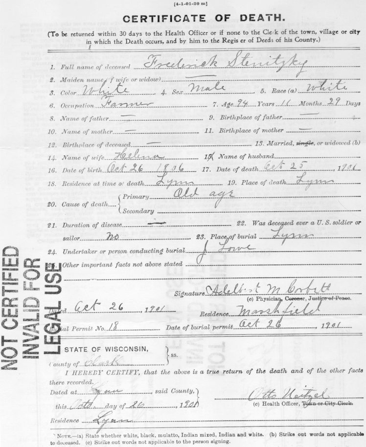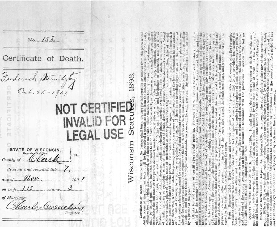 General Mitchell Airfield, Village of Cudahy and City of St. Francis are included in that area. Death Certificate of Frederick Sternitzky: front side view, reverse side view Photo of the Tombstone of Frederick and Helena Sternitzky. |
