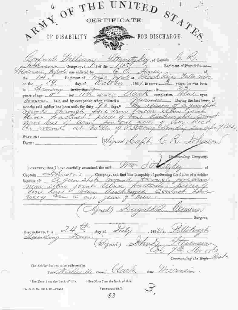 Sternitzky,William (Biography & Photo); Civil War Union Army Certificate of Disability for Discharge, Pension Form