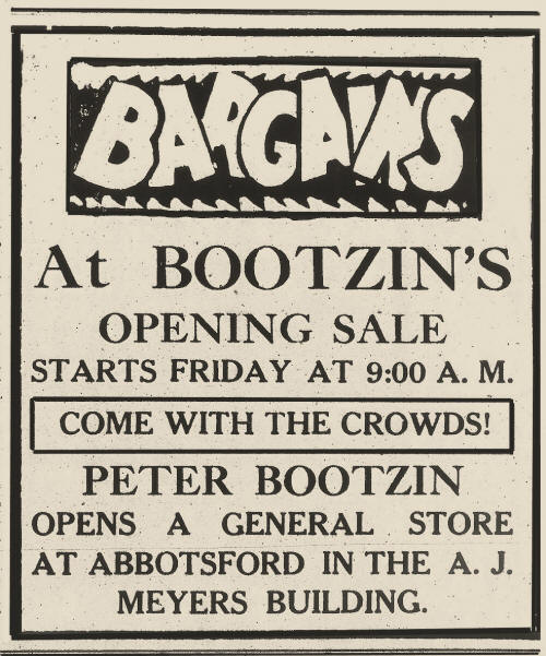 This business belonged to Peter Bootzin and was located in the A. J. Meyers Building in Abbotsford, Wisconsin.