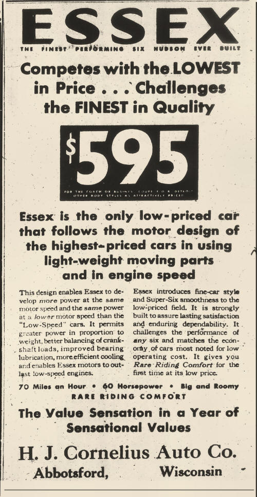 The advertisement above, featuring "Essex Automobiles" appeared in the "Curtiss Advance", March 25, 1931.