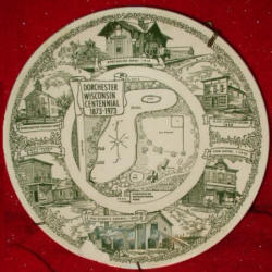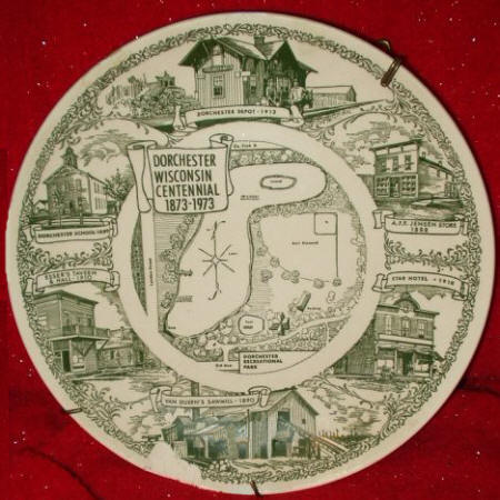 This Dorchester Centennial commemorative plate, pictured below, is green and white and depicts: Dorchester Depot, Dorchester School, Esser's Tavern and Hall, Van Dusen's sawmill, Star Hotel, and the A.F.F. Jensen Store. Steve Genrich