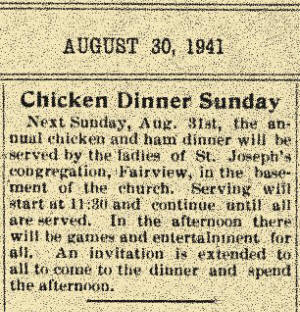 An advertisement featuring the Annual Chicken & Ham Dinner at St. Joseph's Catholic Church, 30 Aug, 1941 Humbird Enterprise.
