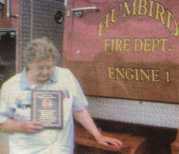 During the Annual Humbird Fire Department picnic, Grace Stevens of Humbird received the “Friend of the Fire Department” award. For a number of years, Stevens has donated her time, expertise and talents to the department. Helping out whenever and wherever needed, she has sold tickets for fundraising functions and helped make and serve food at these functions as well as fought the cold during the annual ice or no-ice fishing contest. She has been a committed/active member of the fire department’s Ladies Auxiliary since it started over 11 years ago. (Contributed photo, 2006). Transcribed by: Delores Kenyon |