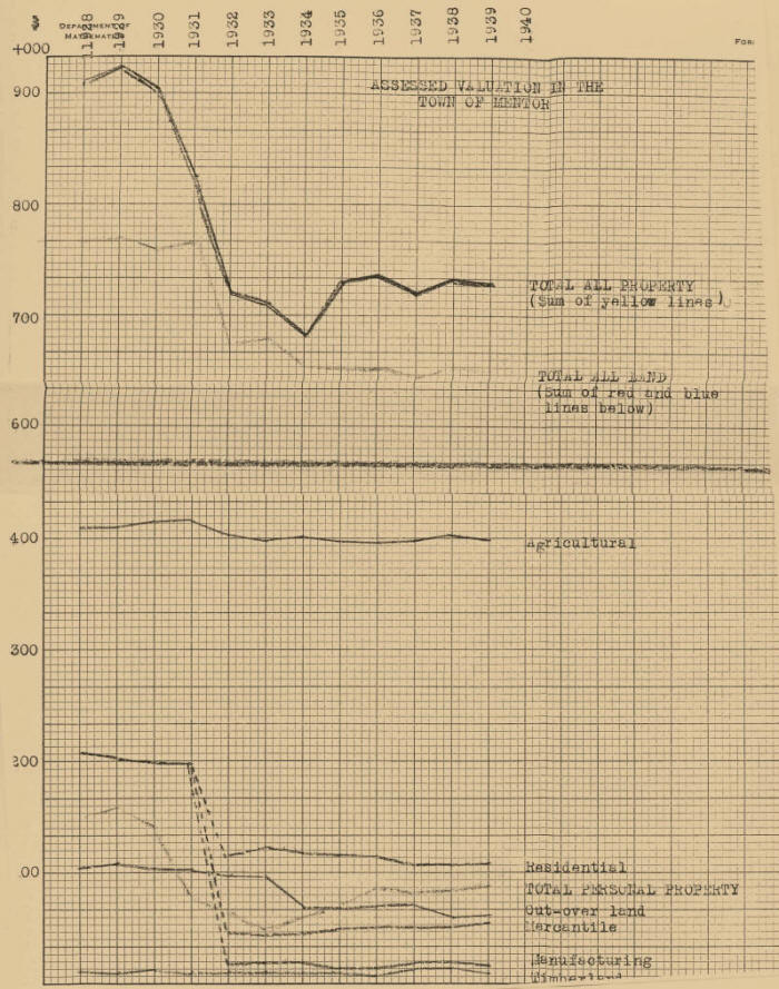 Graph # I in the appendix shows the profiles of the several assessment categories for the past decade in the Town of Mentor. The average downward tendency of valuation is quite apparent in all classifications, as well as the precipitous decline of aggregate or total valuation. The farming and country land, (shown in red on the graph), seems to be the most stable. The agricultural land is the biggest class, and is least subject to fluctuation. The cut-over country and the small residue of timberland have been too swampy and inaccessible to be worth much to begin with, and so had little value to lose. It is mostly contiguous with the Clark County Forest Crop Land, which has comprised much of the two easternmost and the northernmost ranges of sections, since its introduction under the present administration. The Town receives an annual income from the state for the Forest Crop Land. (cf. item June 19, 1939, treasurer’s account of receipts in the report of the Town Board of Audit, in the appendix); The Residential, Mercantile and Manufacturing property, (shown in blue), comprises but a minor part of the assessment, for Mentor is a rural, farming town. Personal Property, (shown in yellow), is also only of a minor status, being valued even under the cut-over and marsh land in the years of most extreme depression.