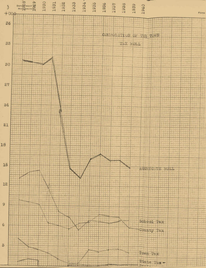 The Town Tax has risen nearly back to normal since its nadir in 1933. A recently published report of the Town Board of Audit is included in the appendix to show the nature of the other receipts of the town, and the disbursements.