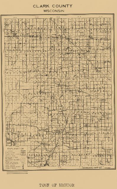 The Town of Mentor is one of the thirty-four in Clark County, the eighth largest County in Wisconsin. It is located in the West-central part of the state, on gently rolling land, is drained by the Chippewa and Wisconsin River systems, and it still has vestiges of its primeval timberland, with medium-sized pine and hardwood on the many ridges which are to be found where the border of the driftless area extends athwart the South-western townships. It was the timber which brought the first permanent settlements to this territory.