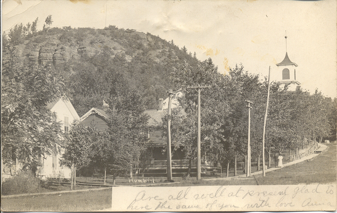 Looking up Main Street at the bluff, homes and the Reformed Church, Photo by W.F. Hein, 1907