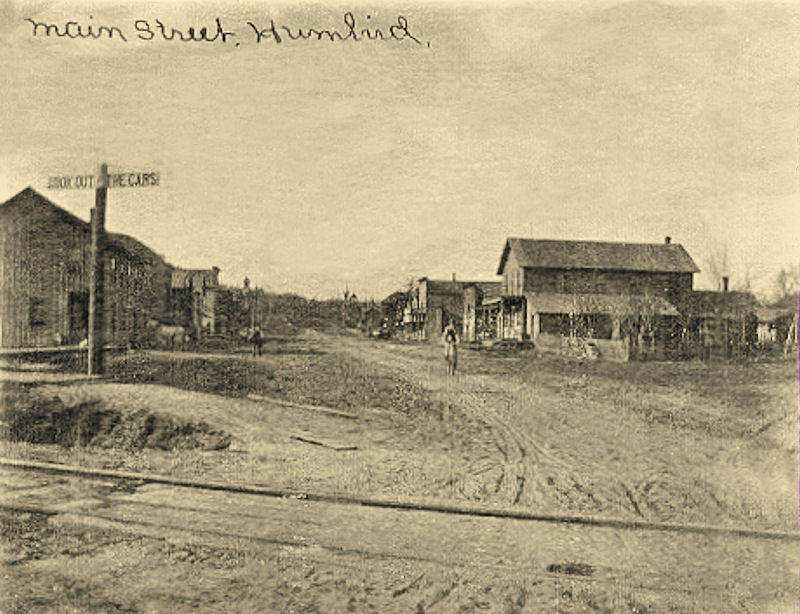 Looking at Main Street from across the Railroad tracks on County Road F, Humbird, WI. Early 1900's.