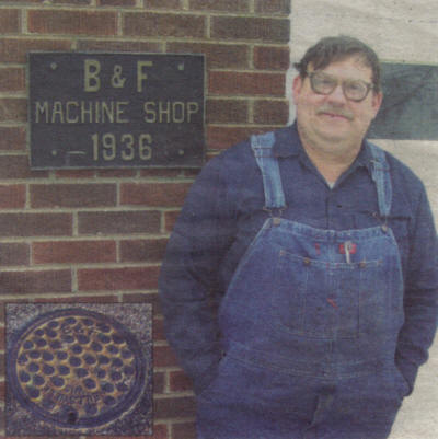 B & F Machine Shop owner Bob Venne poses outside his Neillsville business, which is celebrating 80 years. Shop founders Earl Bruhn and Martin Feuerstein opened the business in 1928; the current shop was built in 1936. The B & F iron foundry cast manhole covers during the 1940s, including one (pictured above) located at Fourth and Sunset Place made in 1947. (Photo by Peter Spicer/Clark County Press)