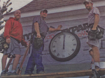 Ryan Schmidt (from left) of RMS Custom Builders, Ryan Hoffman of Hoffmann Construction and Kenny Johnson of KTJ Construction pose Friday, Sept. 3, 2010, with the 32-inch clock they installed at Greenleaf Market, located at 2 Grand Avenue in Neillsville, which will open this fall. All three businesses involved with the project are located in Neillsville. Jeff and Tracy Selk are the owners of Greenleaf market, with will feature health foods. (Photo by Peter Spicer/Clark County Press)
