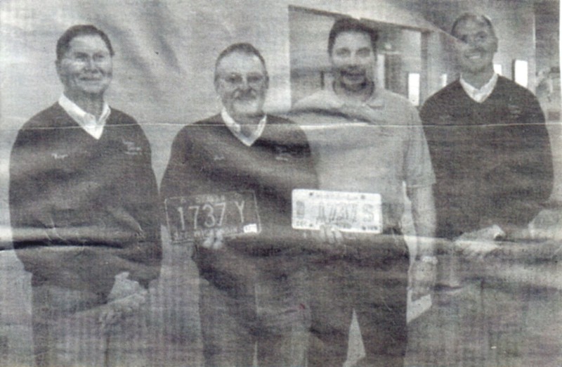 Gross Motors in Neillsville salesman Jim Schultz (second from left) displays dealer plates from the first and last vehicles he sold during his 28 years at Gross and poses with (from left) Wayne, Jerry and Mike Gross of Gross Motors. (Photos by Peter Spicer/Clark County Press) |