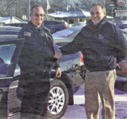 Above, Jim Schultz (right) of Neillsville’s Gross Motors shakes hands with Neillsville Police Chief Brad Lindner in front of the 2010 Chevy Impala the Police Department purchased from Gross Motors.
