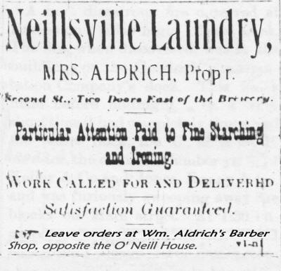 The advertisement above, featuring the Neillsville Laundry, appeared in "The Neillsville Times" in 1882. It names the proprietor as Mrs. Aldrich and notes that laundry may be left at Wm. Aldrich's Barber Shop, opposite the O'Neill House.