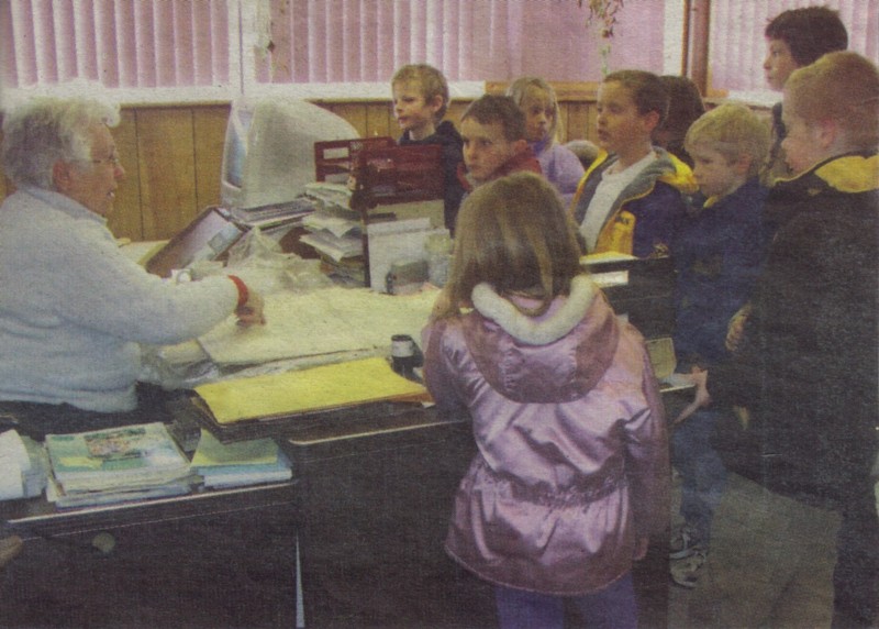 Dee Zimmerman is explaining the difference in the quality of newsprint to these young visitors at the Press office last Friday afternoon. The Junior Achievement class from St. John’s Lutheran School; saw first hand how a newspaper was put together each week.