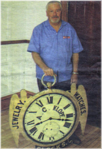 Sniteman Pharmacy co-owner Bill Weiler poses with a clock previously displayed outside the pharmacy when C. C. Sniteman owned the pharmacy many years ago. A jewelry shop was located in the building, along with the pharmacy, in the 1800s and into the 1900s. The Pharmacy is celebrating a completed remodeling job by holding a grand opening celebration. (Photo by Peter Spicer/Clark County Press) |