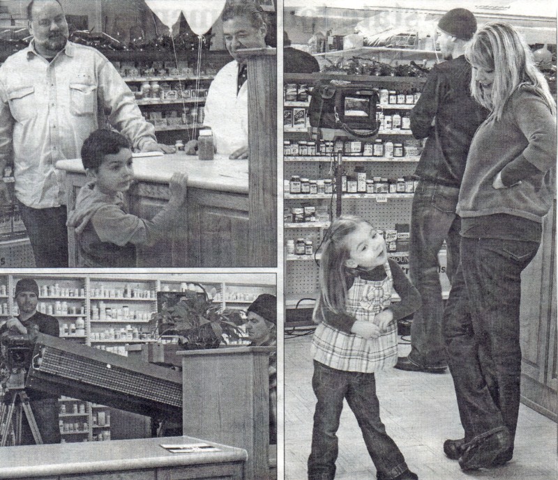 There was a bit of excitement at Sniteman Pharmacy Thursday morning, Dec. 10, as a film production crew, Diversified Media Resources, Inc., of St. Cloud, MN, came to film a television commercial for Good Neighbor Pharmacy. Sniteman’s is the local Good Neighbor Pharmacy. (Lower left) The film crew is setting up lights and cameras. (Upper left) The production leader (l) is working with the little boy and druggist, who are actors. (Right) A little girl and her mother, who came from Minnesota, are taking a break from filming. Different actors were used for the children and druggists in the commercial. Business at Sniteman Pharmacy went on as usual during the filming, although most patrons wondered what was going on. (Photo by Nancy Halterman/Clark County Press)