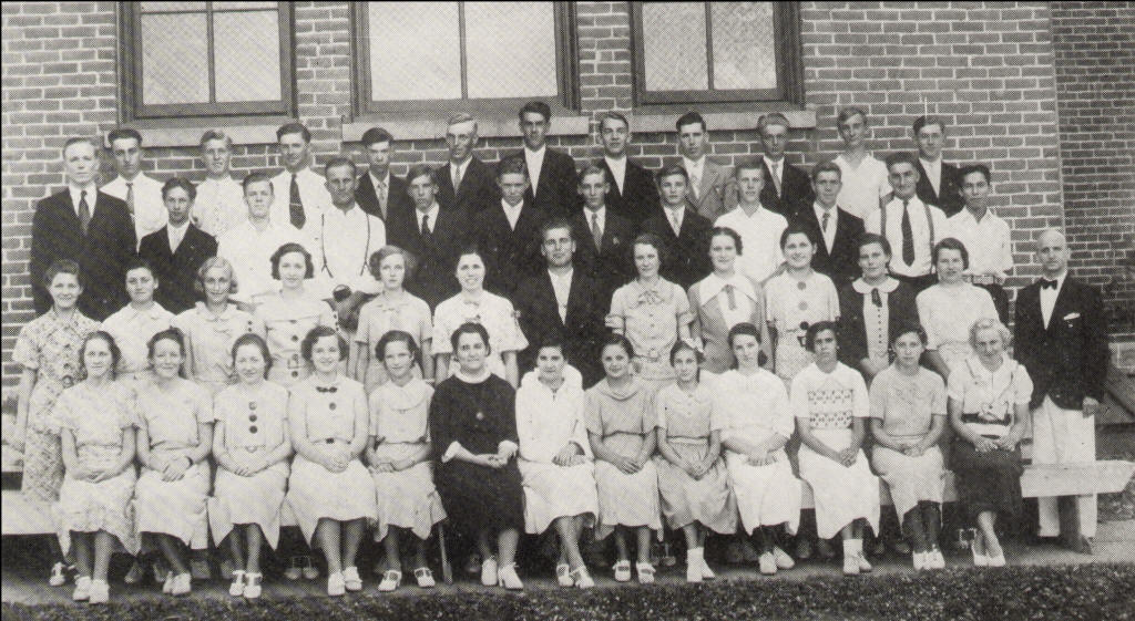 Second Row: Viola Hanschman, Lavern Kuhl, Ruth Wagner, Marion Dux, Theola Pagenkopf, Velda Tews, Walter Beyer, Bertha Stelter, Rosaly Stelter, Edna Tews, Helen Pagenkopf, Marveline Duge, Pastor Wm. A. Baumann
