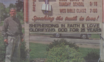Neillsville’s St. John’s Lutheran Church Pastor Tim Biebert poses next to his church’s sign Tuesday, June 9. Biebert has served in the ministry for 25 years, including 14 years in Neillsville.