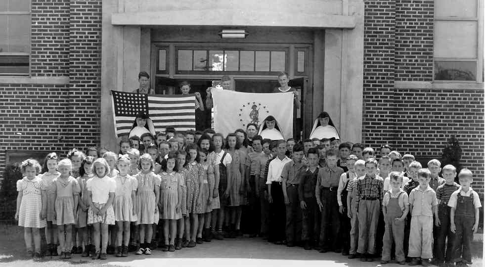 The entire student body and staff of St. Marys School gathered for this photograph in 1944.