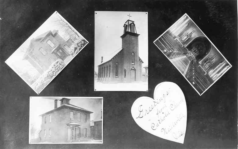 This postcard, which dates from about 1900, showed the three structures atop St. Mary’s hill at that time: the church built in 1878 (top middle), the rectory built in 1884 (top left) and the school built in 1887 (bottom left). There is also an interior view of the church. Only the rectory survives. |