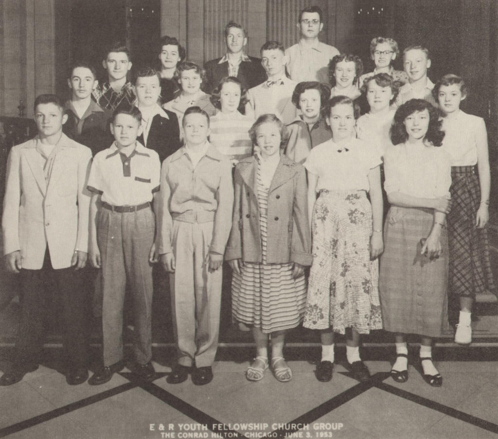 Our other goal has been some contact with the outside world. We formerly sent delegates to the Summer Camp at Green Lake. This is still considered. However during the last two years we have centered our attention on group field trips, because more of the members have a chance to share the experience. These trips have been: Northern Wisconsin in August of 1952; the St. Paul area in October of 1952; and a trip to Chicago in June of 1953. On each trip some church related institution was visited in order to acquaint the children with the overall church work.